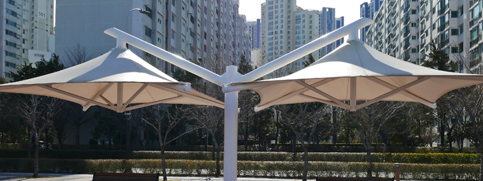 비오에스 천막 자체 공장에서 파이프 구조물 등 을 제작하고 천막 원단을 가공하고 재단하여 천막을 만듭니다.